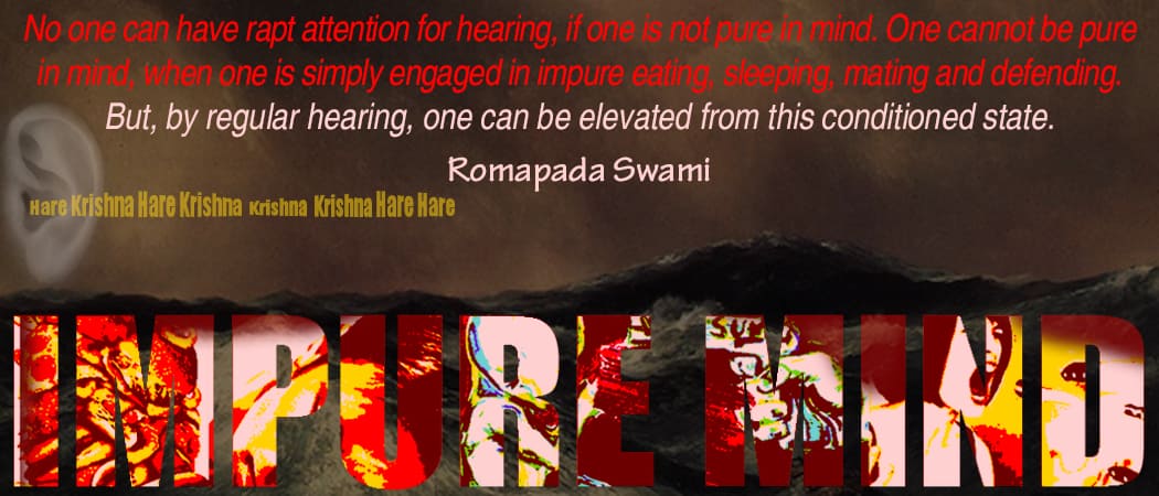No one can have rapt attention for hearing, if one is not pure in mind. One cannot be pure in mind, when one is simply engaged in impure eating, sleeping, mating and defending. But, by regular hearing, one can be elevated from this conditioned state – Romapada Swami