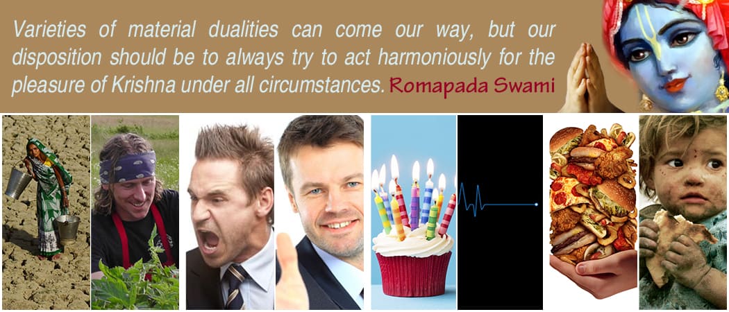 Varieties of material dualities can come our way, but our disposition should be to always try to act harmoniously for the pleasure of Krishna under all circumstances.