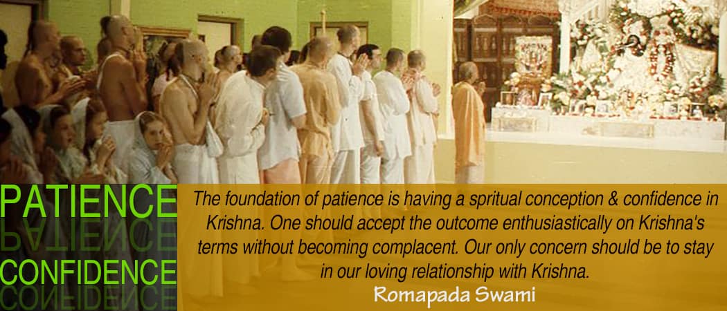 The foundation of patience is having a spritual conception and confidence in Krishna. One should accept the outcome enthusiastically on Krishna’s terms without becoming complacent. Our only concern should be to stay in our loving relationship with Krishna.