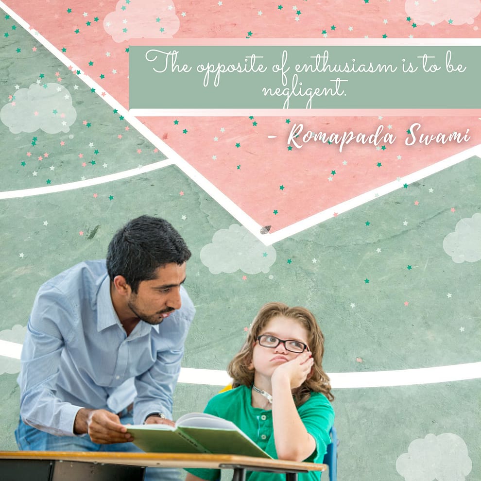 The opposite of enthusiasm is to be negligent. There are different gradations of negligence. The lowest grade is doing nothing, inactivity. Apathy is shown when you do something but you really just don’t care. You are careless and sloppy. Then there is distraction, where you are doing but your attention isn’t fully absorbed. Enthusiasm is the opposite: the mind is absorbed!