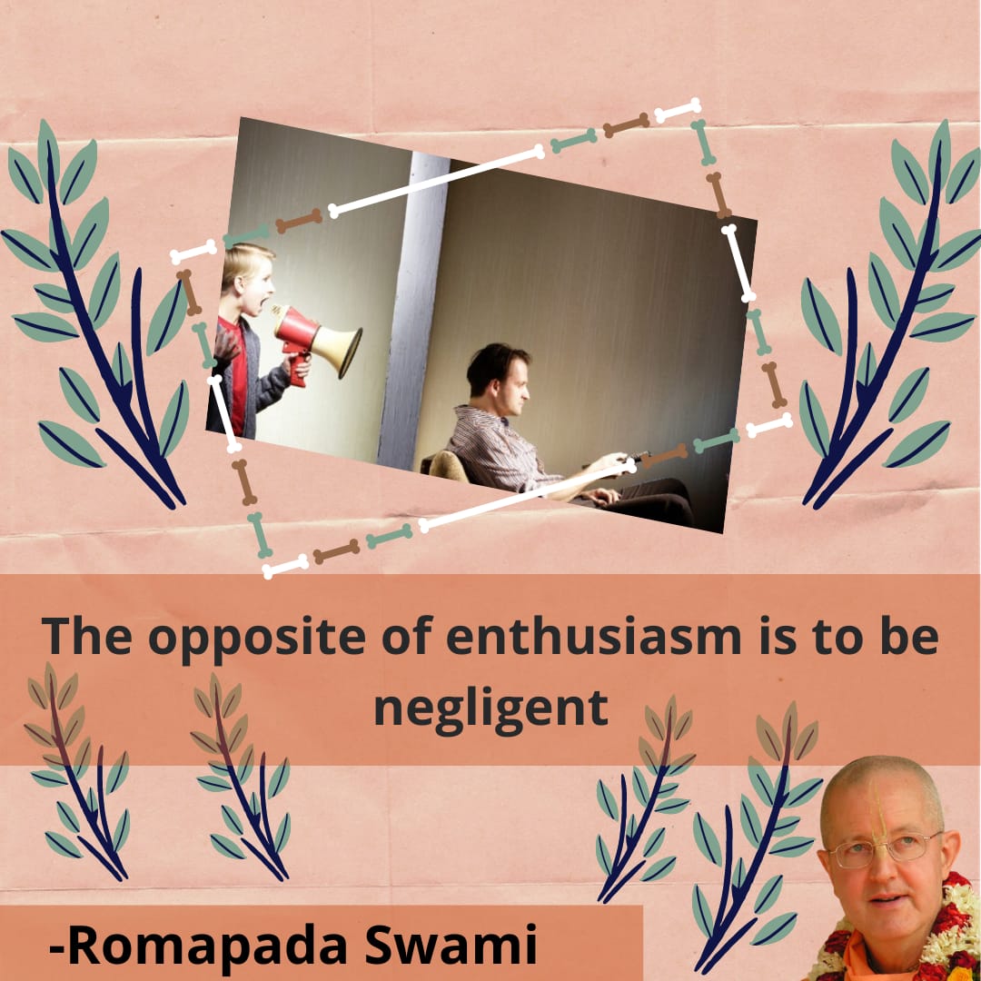 The opposite of enthusiasm is to be negligent. there are different gradations of negligence. The lowest grade is doing nothing, inactivity. Apathy is shown when you do something but you really just don’t care. You are careless and sloppy. Then there is distraction, where you are doing but your attention isn’t fully absorbed. Enthusiasm is the opposite: the mind is absorbed!