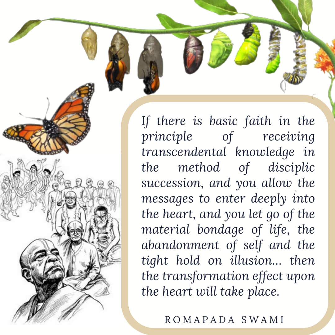 If there is basic faith in the principle of receiving transcendental knowledge in the method of disciplic succession, and you allow the messages to enter deeply into the heart, and you let go of the material bondage of life, the abandonment of self and the tight hold on illusion… then the transformation effect upon the heart will take place.