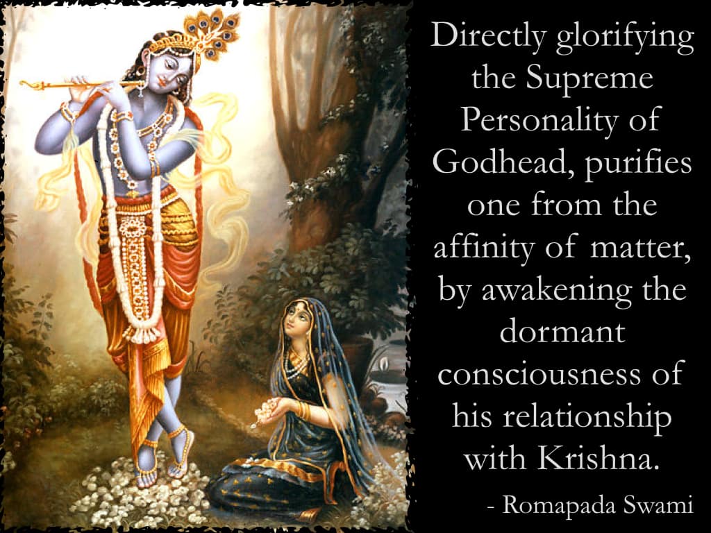 Directly glorifying the Supreme Personality of Godhead, purifies one from the affinity of matter, by awakening the dormant consciousness of his relationship with Krishna.