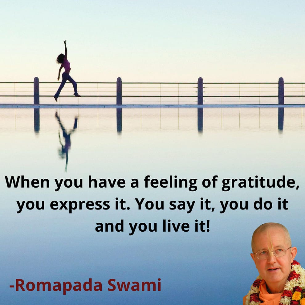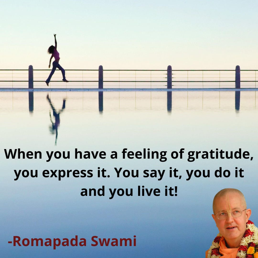 When you have a feeling of gratitude, you express it. You say it, you do it and you live it – living a life of gratitude! A life of devotion is a life of gratitude. On the other side, apathy is carelessness or callousness or foolishness. So we can stir up our feelings by understanding who it is that we are serving by contemplating, “I care about that person whom I am serving”. Thus, there will be feelings within the activities that we perform.