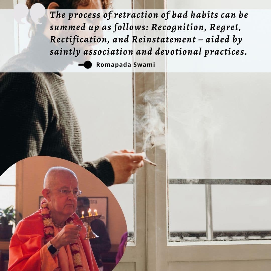 The process of retraction of bad habits can be summed up as follows: Recognition, Regret, Rectification, and Reinstatement – aided by saintly association and devotional practices.