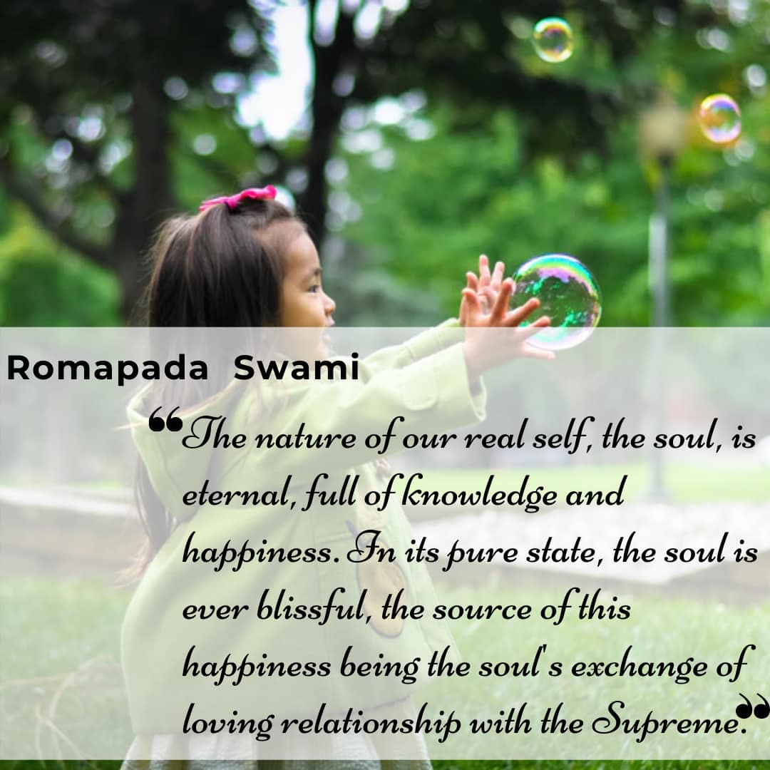 The nature of our real self, the soul, is eternal, full of knowledge and happiness. In its pure state, the soul is ever blissful, the source of this happiness being the soul’s exchange of loving relationship with the Supreme.