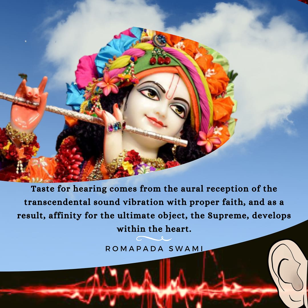 Taste for hearing comes from the aural reception of the transcendental sound vibration with proper faith, and as a result, affinity for the ultimate object, the Supreme, develops within the heart