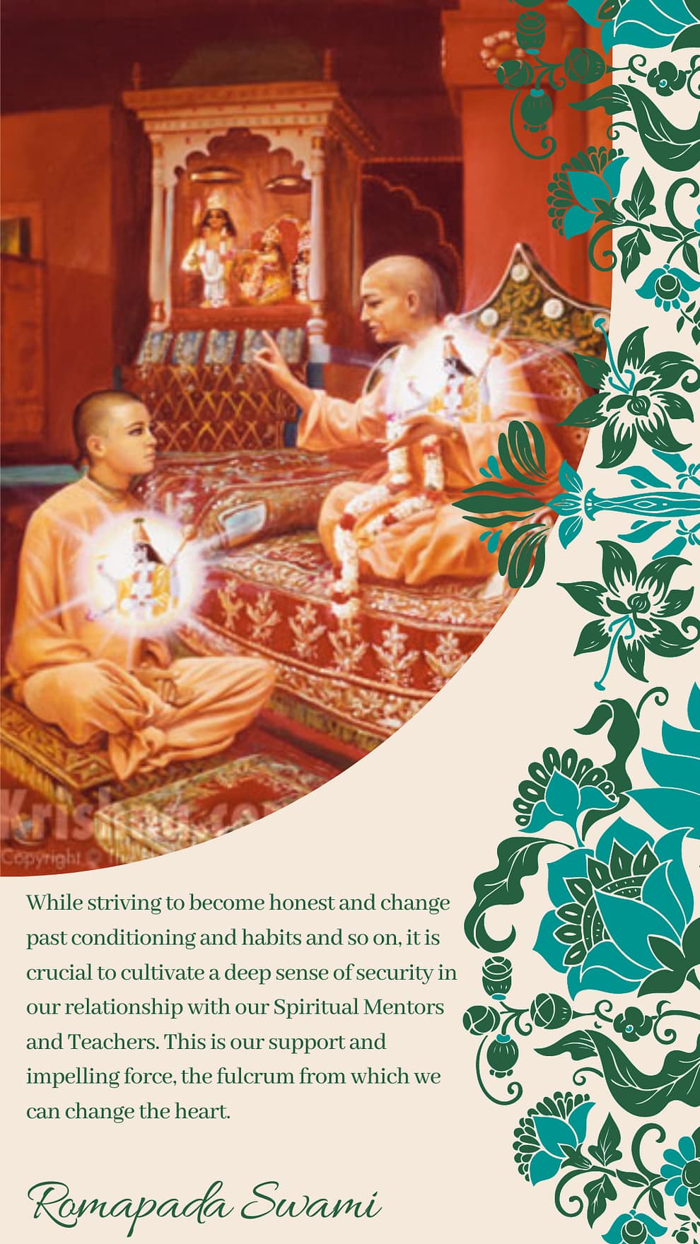 People in general are so absorbed in external accomplishments that they are unaccustomed and even afraid of being truthful, even to themselves. Therefore, while striving to become honest and change past conditioning and habits and so on, it is crucial to cultivate a deep sense of security in our relationship with our spiritual mentors and teachers. This is our support and impelling force, the fulcrum from which we can change the heart.