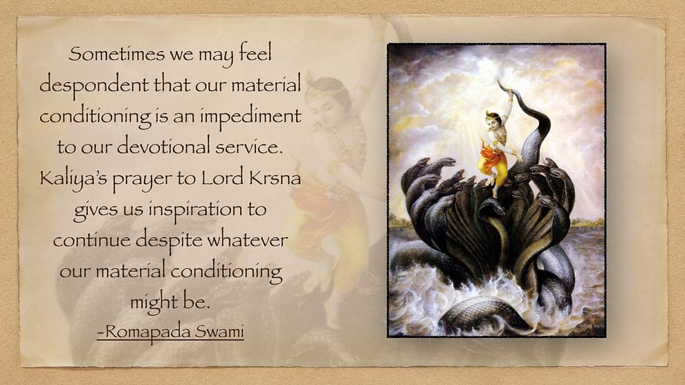 Sometimes we may feel despondent that our material conditioning is an impediment to our devotional service. Kaliya’s prayer to Lord Krishna gives us inspiration to continue despite whatever our material conditioning might be.