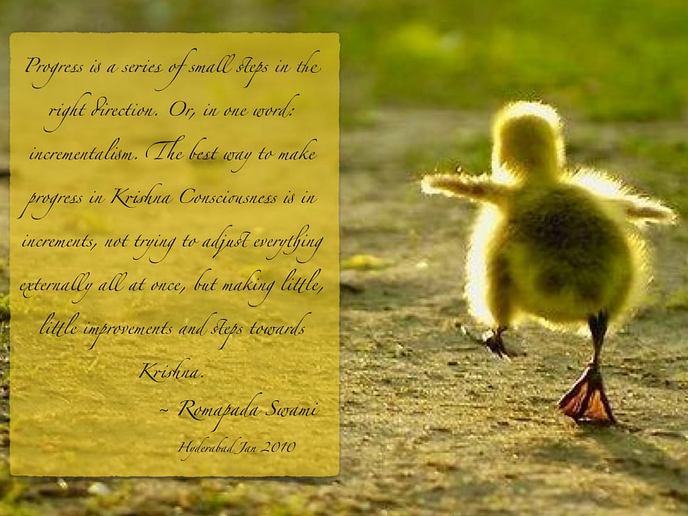 Progress is a series of small steps in the right direction. Or, in one word: incrementalism. The best way to make progress in Krishna Consciousness is in increments, not trying to adjust everything externally all at once, but making little, little improvements and steps towards Krishna.