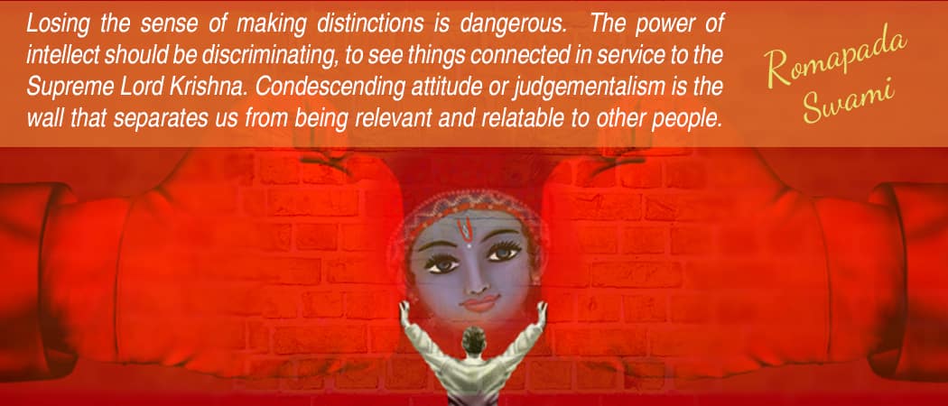 Losing the sense of making distinctions is dangerous. The power of intellect should be discriminating, to see things connected in service to the Supreme Lord Krishna. Condescending attitude or judgementalism is the wall that separates us from being relevant and relatable to other people.