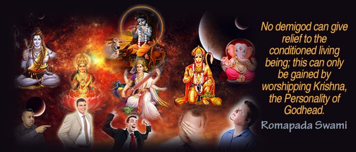 There is a picture of Hanuman in the photo of this quote. I have heard that Hanuman is not a demigod, but a devotee of the Lord. Therefore, he is not in the same category as a demigod. Please kindly confirm.