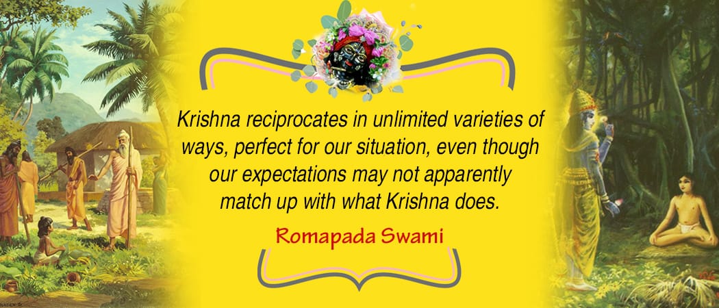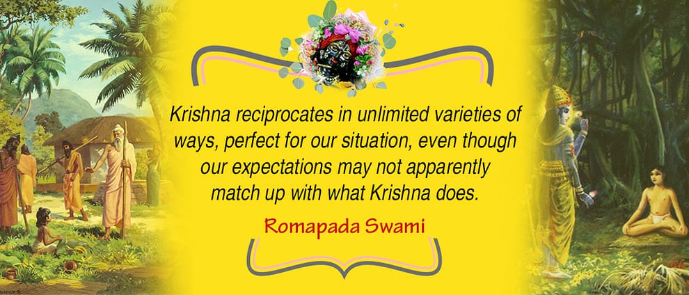 Krishna reciprocates in unlimited varieties of ways, perfect for our situation, even though our expectations may not apparently match up with what Krishna does. – Romapada Swami