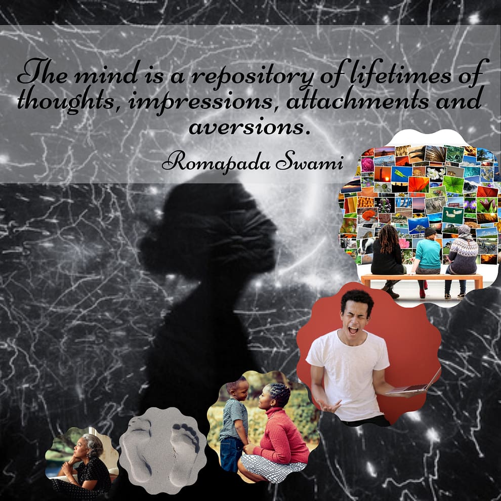 The mind is a repository of lifetimes of thoughts, impressions, attachments and aversions. It is also greatly and very subtly affected by our immediate circumstances and surroundings. The food we eat, the company we keep, our daily activities, the sounds and sights we are exposed to, etc., have a great bearing upon our mental state.