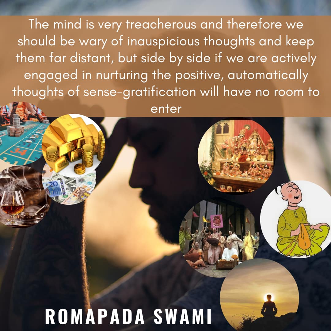 The mind is very treacherous and therefore we should be wary of inauspicious thoughts and keep them far distant, but side by side if we are actively engaged in nurturing the positive, automatically thoughts of sense-gratification will have no room to enter.