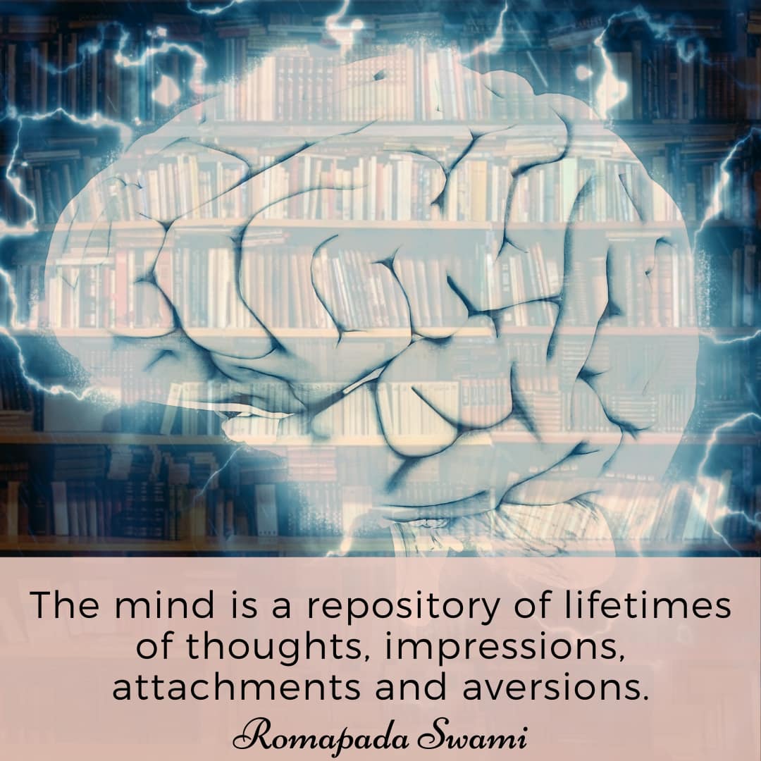 The mind is a repository of lifetimes of thoughts, impressions, attachments and aversions. It is also greatly and very subtly affected by our immediate circumstances and surroundings. The food we eat, the company we keep, our daily activities, the sounds and sights we are exposed to, etc., have a great bearing upon our mental state.