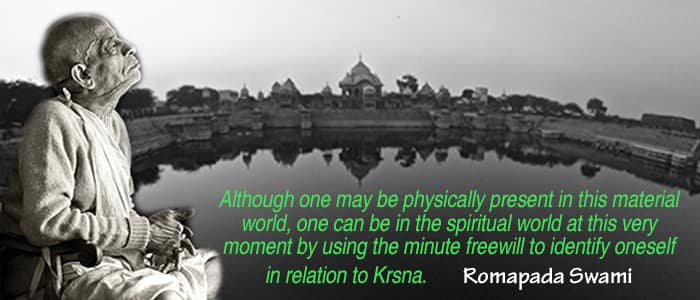 Although one may be physically present in this material world, one can be in the spiritual world at this very moment by using the minute freewill to identify oneself in relation to Krishna – Romapada Swami