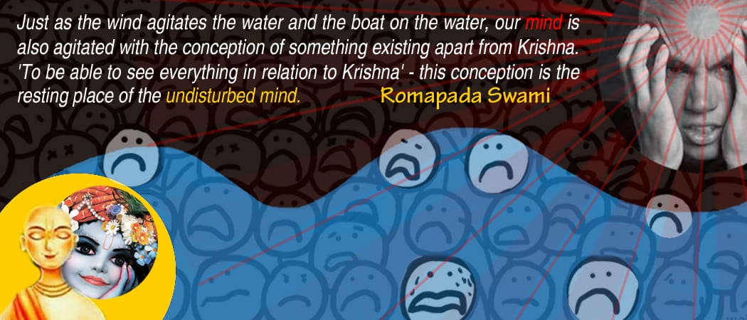 Just as the wind agitates the water and the boat on the water, our mind is also agitated with the conception of something existing apart from Krishna. ‘To be able to see everything in relation to Krishna’ — this conception is the resting place of the undisturbed mind.
