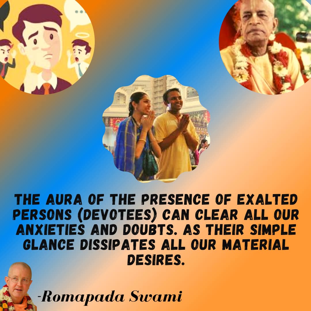 The aura of the presence of exalted persons (devotees) can clear all our anxieties and doubts. Their simple glance dissipates all our material desires.